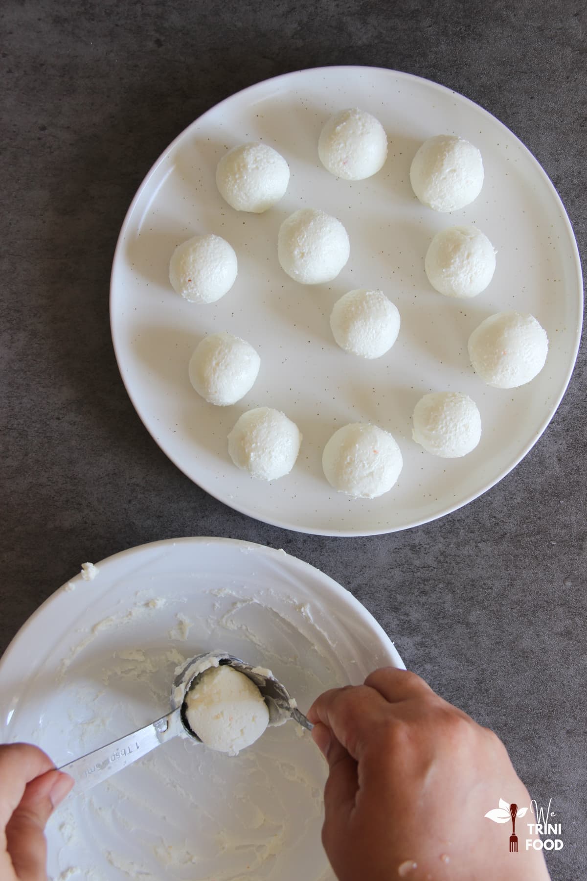 • Use a tablespoon and a small teaspoon to divide the mixture into 13 even pieces. (For smaller balls, use a 1/2 tablespoon to divide the mixture).